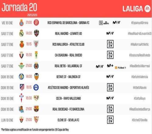 西甲官方公布了第20轮比赛开球时间,皇马vs莱万特将于北京时间1月17日21:00开打,皇家社会vs巴萨将于北京时间1月19日凌晨4:00进行。